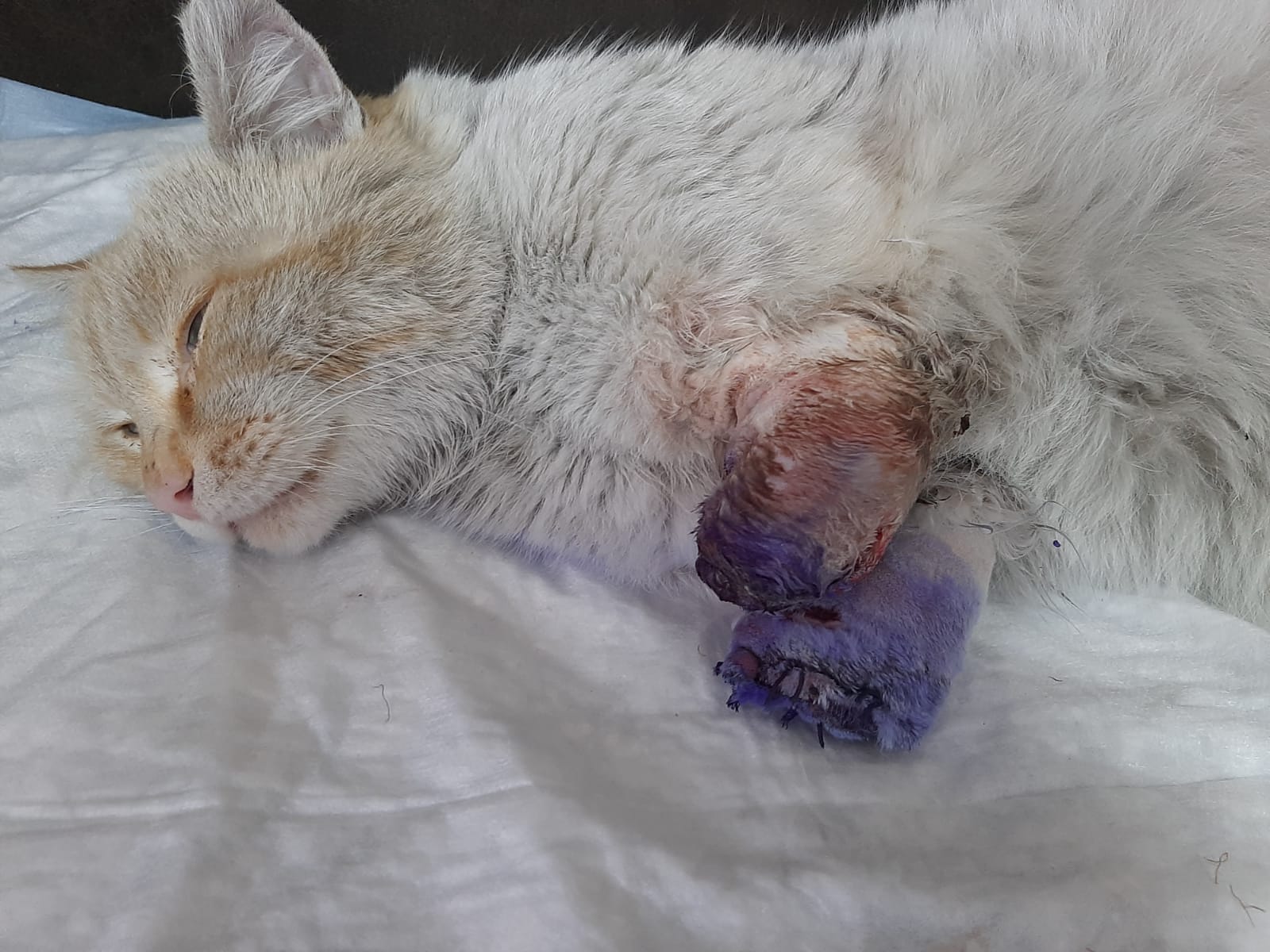 Котик был очень слаб и переохлажден. Оперировать в таком состоянии никак нельзя. Он не переживет наркоз. И, в то же время, нужно было оперировать срочно. Сгнили не только передние лапки, но и задние с обеих сторон выгнили до кости. А стойкий запах разложения говорил о том, что везде бушует инфекция. И если заражение крови еще не произошло, то может случится в любую минуту. Нужно было срочно удалять все пораженные ткани. Так же следовало решить что можно спасти. Это всегда очень тяжелое решение. Всегда хочется сохранить побольше. Но... У котика не хватит ресурса, чтобы восстановиться. Всё же решили рискнуть. Полностью сохранить задние лапки, а передние ампутировать, но максимально сохранить длину культи.